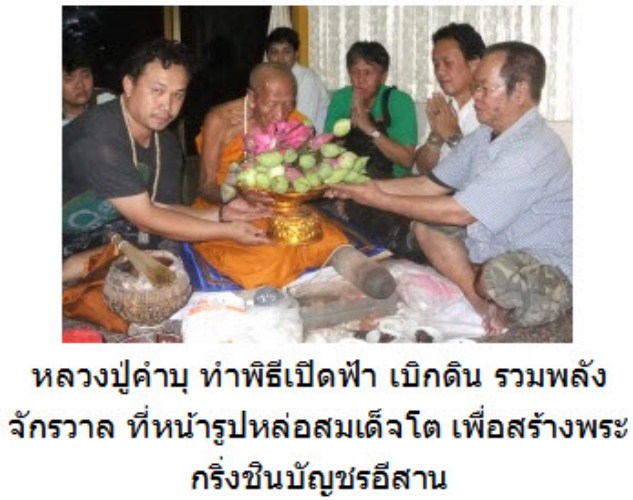 โดยให้ศิษย์ใกล้ชิดไปตาม อ.ชินพร มายังวัดระฆังโฆสิตาราม อันเป็นต้นกำเนิดของพระคาถาชินบัญชรอันศักดิ์สิทธิ์ให้มาทำพิธีปลุกเสกผงกรรมฐาน ปทุมเจ็ดสระมงคลและลงถมยันต์ครอบจักรวาลและยันต์ การะเวกเรียกทรัพย์ สุดยอดทางมหานิยมชั้นสูง ญาท่านคำบุยังได้มอบของดีอีกอย่างคือ น้ำมันสาวพรหมจรรย์ ซึ่งเป็นที่ต้องการของศิษย์สายญาท่านคำบุเป็นอย่างมาก ด้วยมุทิตาจิตต่อญาท่านคำบุ อ.ชินพร จึงนำผงพรายกุมารและผงสัตตามาสที่หลวงปู่ทิมปลุกเสกนานถึง ๗ เดือนมาประสานกับผงวิเศษและน้ำมันสาวพรหมจรรย์อันเป็นสุดยอดวิชาของญาท่านคำบุ ทั้งยังได้ผงฤาษีเบิกไพร จากฤาษีเพชรดำดาบส ครั้งธุดงส์ในป่านาน ๑๗ ปี ให้เป็นเอกอุ แห่งมวลสารของกายสิทธิ์ธาตุแห่งเมืองบัวงามอุบลราชธานี เพื่อผสมสร้างพระกริ่งชินบัญชรอีสาน(ญาท่านคำบุ) ทั้งอุดผงและปั้นเป็นผลคุณ