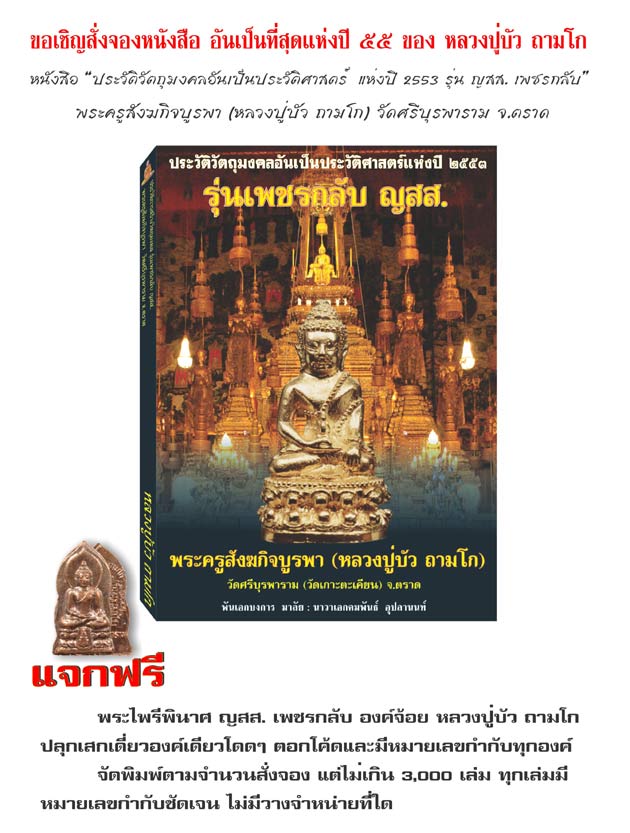 ปกแข็งอย่างดีหนา 150 หน้า มีภาพประมาณ 200 ภาพ ราคาเล่มละ 599.- บาท ค่าจัดส่ง EMS ทั่วประเทศเล่มละ 100.- บาท (ยกเว้นผู้ที่จะมารับหนังสือเองไม่ต้องเสียค่าส่ง) กำหนดสิ้นสุดวันรับจอง 29 กพ.55 พร้อมส่งมอบหนังสือประมาณวันที่ 10 มีค.55 หนังสือพิมพ์ตามจำนวนจอง ท่านที่จองรบกวนกรุณาโอนเงินเป็นเศษสตางค์ ตัวอย่างเช่น 699.05 บาทหรือ 699.11 บาท เพื่อสะดวกในการตรวจสอบ โอนเงินเข้าบัญชี นายทศพร พฤฒิวงศ์วาณิช ธ.กสิกรไทย ส.ถนนศรีรองเมือง เลขบัญชี 1482650593 โทร 087-5854033 พร้อมทั้งแจ้งชื่อและที่อยู่ที่ต้องการให้จัดส่งในกระทู้ด้วยครับ วัตถุมงคลชุดเพชรกลับ หลวงปู่บัว ถามโก นับได้ว่าเป็นวัตถุมงคลที่มีเอกสารครบถ้วนที่สุด นับตั้งแต่ครั้งแรกออกเอกสารการจองมีจำนวนสร้างและราคาชัดเจน ครั้งที่สองออกสุจิบัตรสรุปจำนวนการสร้างจำนวนที่แท้จริงและภาพในวันประกอบพิธีที่วัดพระแก้ว สุดท้ายครั้งที่สามเป็นหนังสือรวมเพชรกลับที่กำลังจะออกในเดือนมีนาคม 55 นี้ ทั้งหมดนี้ถือได้ว่าเป็นการออกเอกสารครบถ้วนกระบวนความที่สุด |