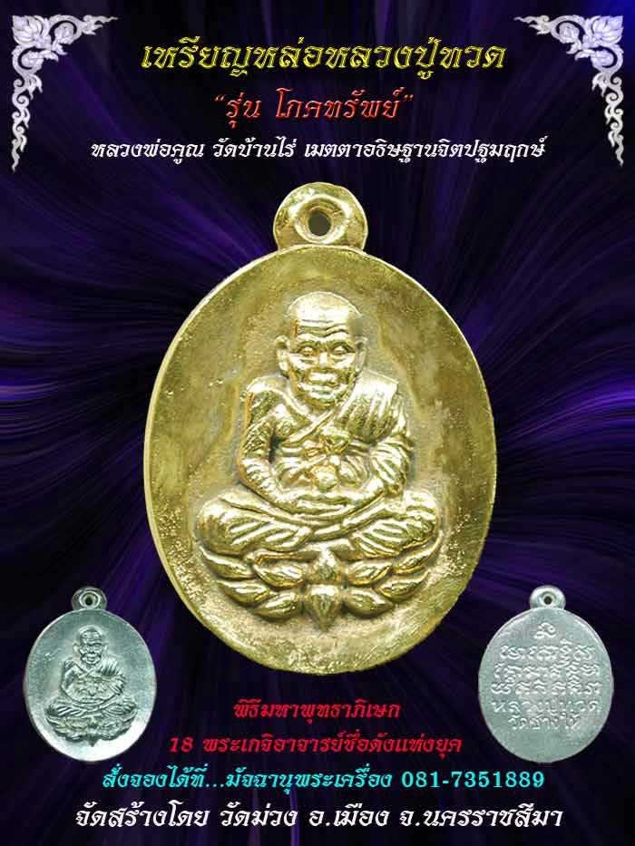 เหรียญหล่อหลวงปู่ทวด รุ่นโภคทรัพย์ ชุดเนื้อทองทิพย์ วัดม่วง จ. นครราชสีมา ปลุกเสกโดยหลวงพ่อคูณ