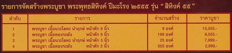 1.พระบูชา เนื้อทองระฆัง หน้าตัก 9 นิ้ว สร้าง 199 องค์ บูชาองค์ละ 8,555 บาท....................มียอด 2 องค์
