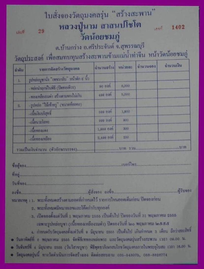 1. พระบูชารูปเหมือนหน้าตัก 9 นิ้ว (นำฤกษ์) สร้างจำนวน 90 องค์ บูชาองค์ละ 11000 บาท มียอด 1 องค์