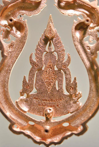 ด้านหลังองค์พระประกอบด้วยยันต์อกเลาอันศักดิ์สิทธิ์และหัวใจคาถายอดศีล พุท ธะ สัง มิ อยู่สี่มุม ตรงซุ้ม บนสุดตัวอุณาโลม ถือว่าเป็นสุดยอดของยันต์ มีคาถาพรพระพุทธชินราชที่เขียนว่า "สทา พุทธชินราชา อภิปาเลตุ ตัง"แปลว่าขออานุภาพแห่งพระพุทธชินราชจงอภิบาลรักษาท่านตลอดไปเทอญ" เป็นความหมายที่เป็นมงคลเท่านี้ยังไม่พอต่อที่แผ่นหลังเหรียญอีก มีคาถา"อิสฺวาสุ"หัวใจคาถาพระพุทธพระธรรมพระสงฆ์ คาถา"มหาลาภลาโภ ภวนฺตุเม" แปลว่าขอความมีโชคลาภทั้งหลายและความนิรันตรายจงบังเกิดแก่ข้าพเจ้า" เป็นการยึดตามแนวคติการออกแบบพระแบบดบราณที่ต้องมีคาถามีความขลังใส่เข้าไป และงานนี้ผมก็ใส่เข้าไปแบบครบถ้วนและมีความหมาย ทั้งยังออกแบบให้อยู่ในจุดที่ปลอมไม่ได้ เลียนแบบยาก เป็นเอกลักษณ์เฉพาะตัว ที่สำคัญหลังองค์พระใช้เลเซอรืแกะเพราะเล็กและละเอียดมากดูตาเปล่าแทบไม่เห็นแต่ส่องกล้องเมื่อไหร่ คมชัด และเมื่อประกอบเป็ยเหรียญอักขระคาถาทั้งหมดจะถูกซ่อนอยู่หลังองค์พระพุทธชินราช ต้องส่องแบบตะแคงหรือมองสะท้อนเงาที่แผ่นหลังจึงจะมองเห็น งานนี้คิดแบบโคตรๆแล้วครับ