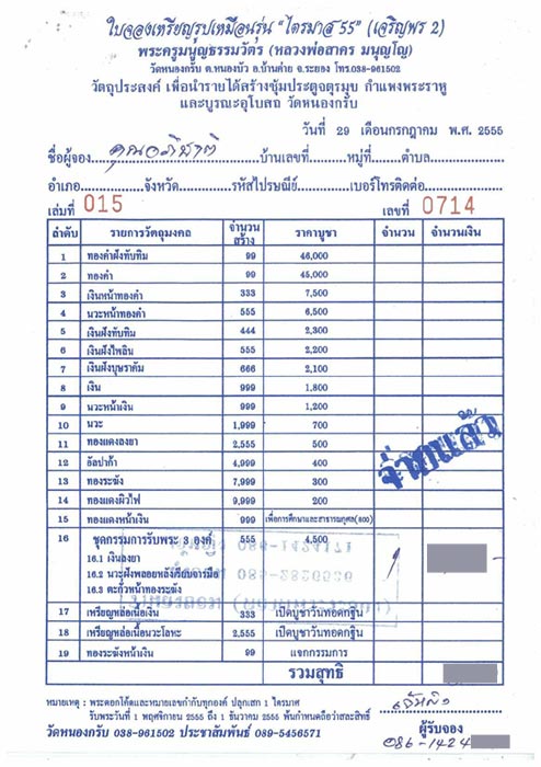 ใบจองหลวงพ่อสาคร เจริญพรไตรมาส