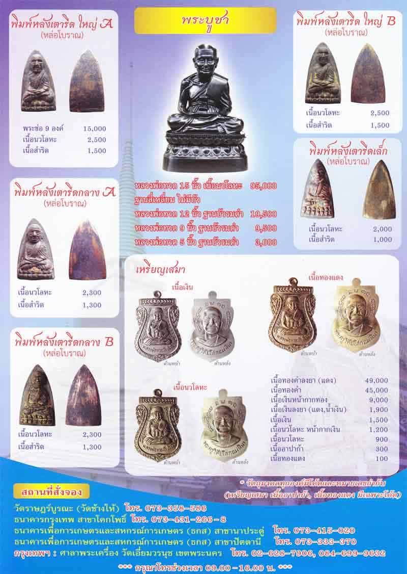 รายการที่ 1. เตารีดพิมพ์ใหญ่ A (หล่อโบราณ) เนื้อสำริด สร้างเพียง 5,555 องค์ มี 5 องค์ๆละ 1,800รายการที่ 2. เหรียญเสมา เนื้อเงินหน้าทองคำมี 2 เหรียญๆละ 10,500บาท