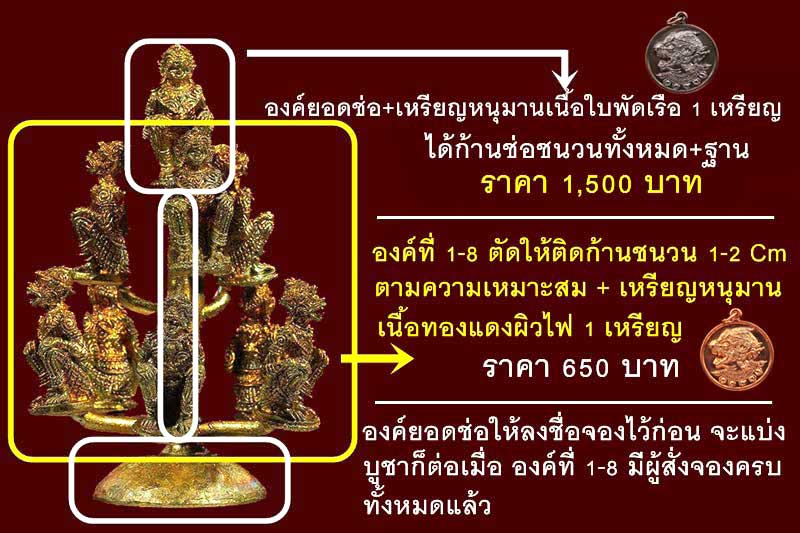 1. องค์ยอดช่อ (ตนที่ 9) 1,500 บาท + เหรียญหนุมานเนื้อใบพัดเรือ 1 เหรียญ ฟรีค่าจัดส่ง (องค์ยอดช่อ จะแบ่งให้บูชา เมื่อมีการจอง องค์ที่ 1-8 ครบก่อนครับ คนที่ลงชื่อจองคนแรกจะเป็นผู้ที่ได้ครับ)