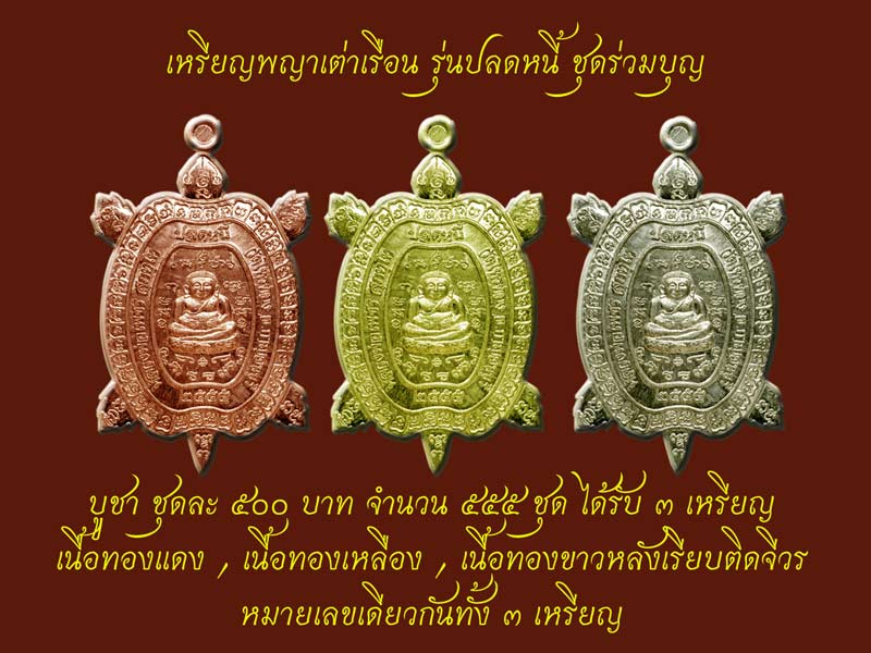 | หัวข้อกระทู้ : +++ เหรียญพญาเต่าเรือน รุ่นปลดหนี้ ชุดร่วมบุญ หลวงพ่อเพชร วัดไทรทองพัฒนา +++ |
