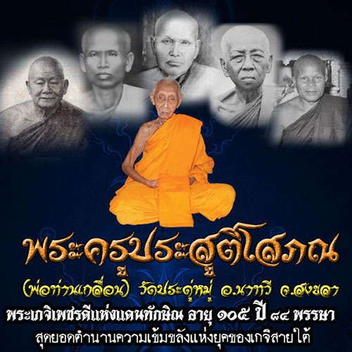 พ่อท่าน เกลื่อน คุณกาโม สิริอายุ 105 ปี 84 พรรษา วัดประดู่หมู่ ต.ฉาง อ.นาทวี จ.สงขลา นามเดิม อั้น ชายะพันธุ์ เกิดเมื่อ วันเสาร์ เดือน 12 ปีระกา โดย ในยามที่ท่านกำเนิดนั้นมีรกพันคอ เชื่อว่าเป็นผู้มีบุญวาสนาดีเป็นยอดคนถือเป็นมงคลนิมิตที่ดี