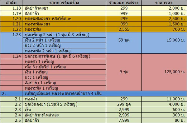 1.เนื้อเงินองค์ทองคำลงยา(เลือกสีไม่ได้) มียอด 1 เหรียญ เหรียญละ 20,000 บาท