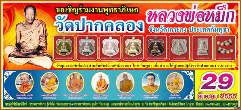 รายได้เพื่อปฏิสังขร วัดปากคลอง จังหวัดเกาะกง ประเทศกัมพูชา พิธีพุทธาภิเษกหมู่ งานนี้รวมสุดยอดเกจิของจังหวัดตราด และจังหวัดเกาะกง ประกอบด้วย