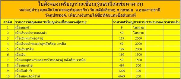 พระเมตตา พระเครื่องเปิดจองเหรียญห่วงเชื่อมหลวงปู่คำบุ รุ่นธรณีสงฆ์มหาลาภ ตามรายการดังนี้