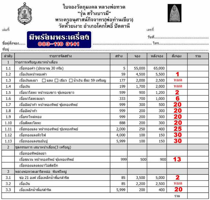 รายละเอียดรายการและจำนวนเปิดจองตามตารางครับ จองแบบฟรีสไตล์ไม่จำกัดรายการและจำนวน สนใจจองรายการไหนลงรายการและจำนวนในกระทู้ได้เลยครับ บุคคลภายนอกที่ไม่ได้เป็นสมาชิกเว๊ป สั่งจองทางโทรศัพท์ได้ครับ