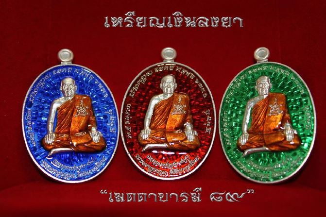 รายการที่ ๔ เนื้อเงินลงยาพื้นสีแดงจีวรเหลือง สร้าง 389 องค์ บูชา 2300 บาท มี 10 องค์