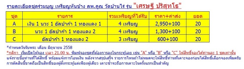 โอนเงินที่เคาะจองเพื่อบูชาสั่งจองได้ที่ คุณวัชระ เจริญสุข ธ.กรุงไทย ออมทรัพย์ เยาวราช 001-118-679-8 โทร.086-415-7899,081-583-0386 หลังจากตัดสินว่าท่านใดจองได้แล้ว