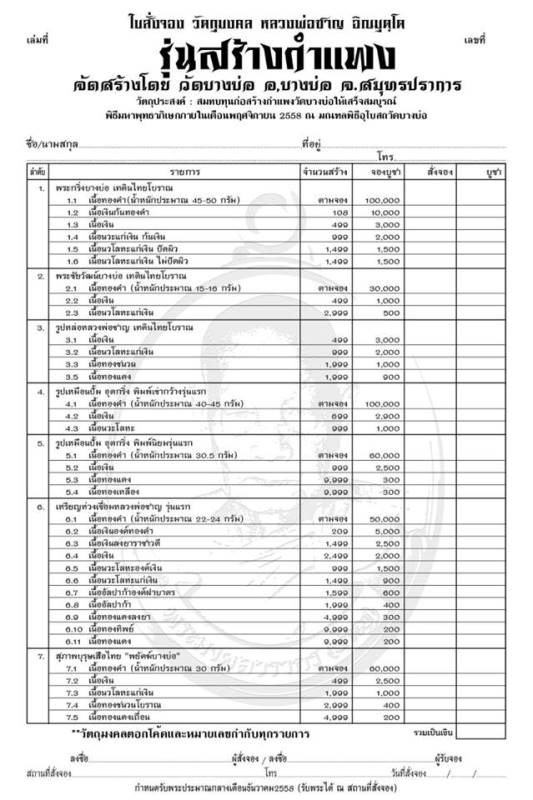 เปิดจองพร้อมกันทั่วประเทศครับ!!! สำหรับ รุ่นสร้างกำแพง งานนี้ งานบุญใหญ่ ของวัดบางบ่ออีกรุ่นครับ รูปแบบออกมาหมดทุกพิมพ์แล้ว เนื่องด้วยกำแพงวัดบางบ่อ ยังต้องการเงินจำนวนมากเพื่อการซ่อมแซมและทำนุบำรุงกำแพงแก้วรอบวัด ซึ่งจำเป็นต้องหาเงินเพื่อใช้ในการก่อสร้างจำนวนมาก ทางผู้ใหญ่หลายๆท่านจึงได้ปรึกษากันขึ้นเพื่อหาวิธีการ และได้ลงความคิดเห็นว่าจะสร้างวัตถุมงคลขึ้นมาอีกรุ่นหนึ่งเพื่อหาเงินไปใช้สร้างกำแพงแก้วในส่วนนี้ จึงตั้งชื่อรุ่นนี้ว่า "รุ่นสร้างกำแพง"