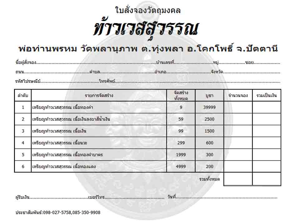 รายการที่เปิดจองท้าวเวสุสวรรณ