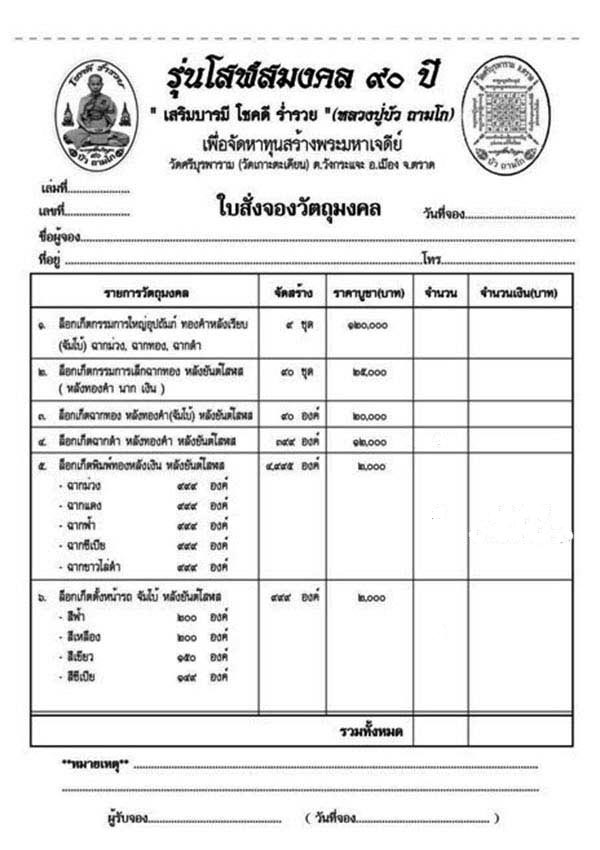 โอนเงินเพื่อสั่งจองบูชา ภายใน 1 วัน หลังจากปิดจอง ได้ที่