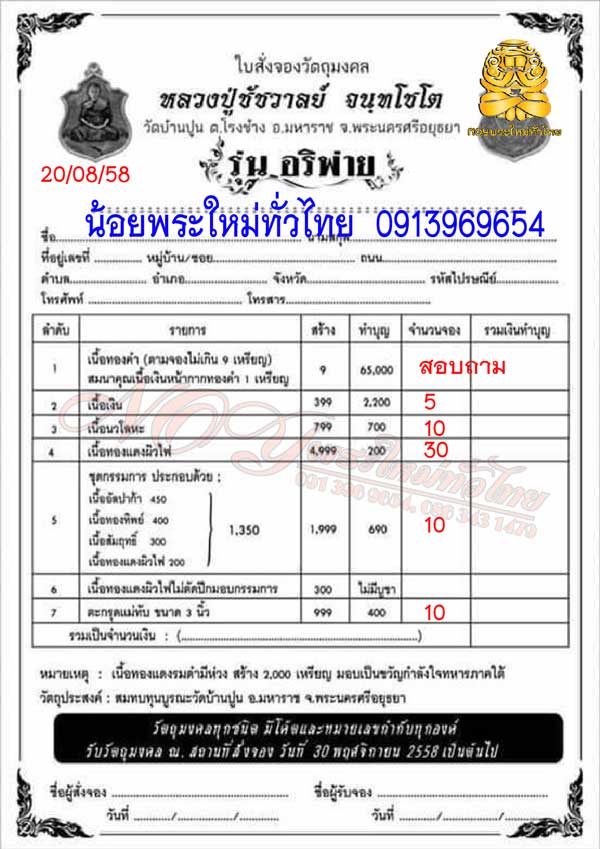 เปิดจอง หลวงปู่ชัชวาลย์ จนฺทโชโต วัดบ้านปูน จ.พระนครศรีอยุธยา"" รุ่น อริพ่าย "" รับวัตถุมงคล วันที่ 30 พฤศจิกายน 58 เป็นต้นไป มีโค๊ตและหมายเลขกำกับทุกองค์ สนใจสอบถามได้ครับ++++++++++++++++++++++++