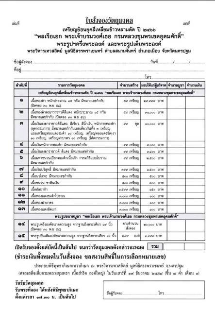 1. เนื้อทองคำ หนักประมาณ ๑๕ กรัม มีหมายเลขกำกับ จัดสร้างตามจองไม่เกิน ๕๙ เหรียญ มอบให้แก่ผู้บริจาค ๒๙,๙๙๙ บาท (ปิดจอง ๓๐ พ.ย ๕๘)