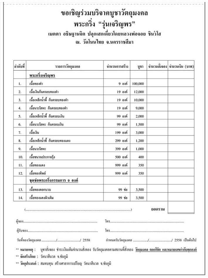 [[[เปิดจอง]]]พระกริ่ง หลวงพ่อจอย ชินวังโส วัดโนนไทย พระกริ่ง รุ่นเจริญพร