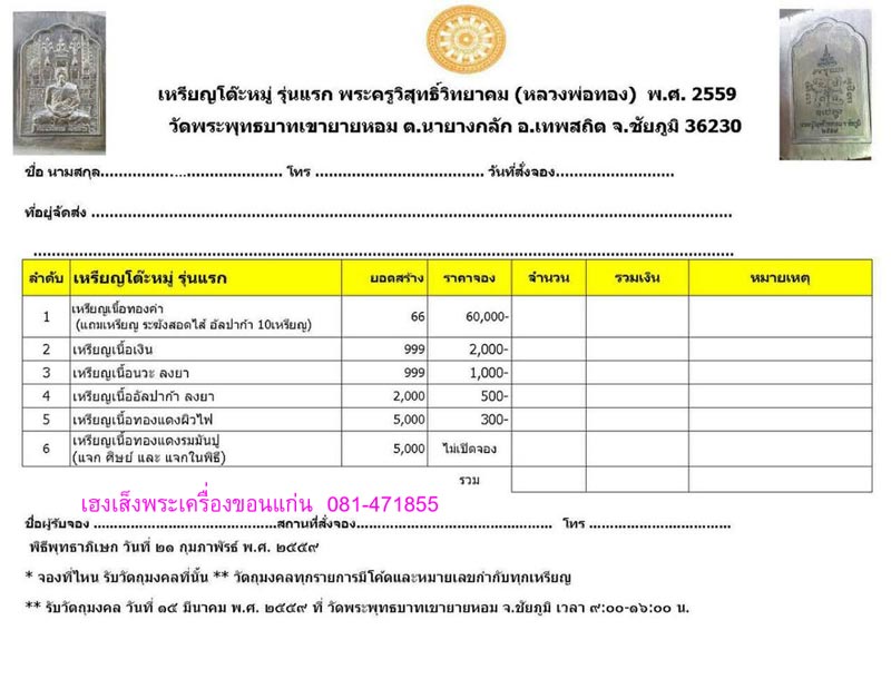 RR เฮงเส็งพระเครื่อง...เปิดจองเหรียญโต๊ะหมู่ รุ่นแรก หลวงพ่อทอง วัดพระพุทธบาทเขายายหอม RR