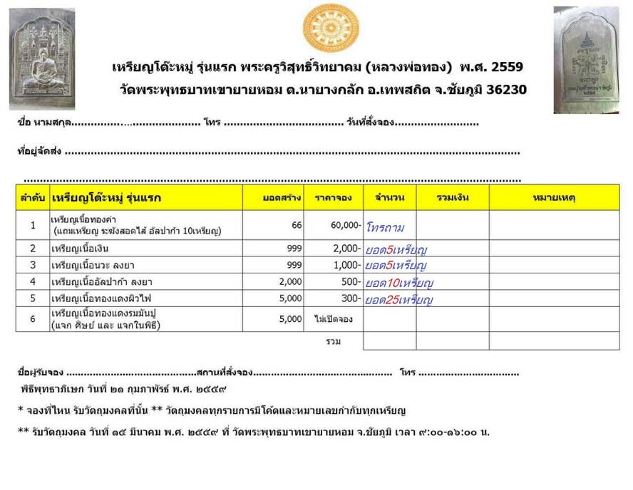 ((ยอดมาใหม่))ฉลองเทศกาลปีหม่ ราคาจอง เหรียญโต๊ะหมู่ รุ่นแรกหลวงพ่อทอง วัดพระพุทธบาทเขายายหอม