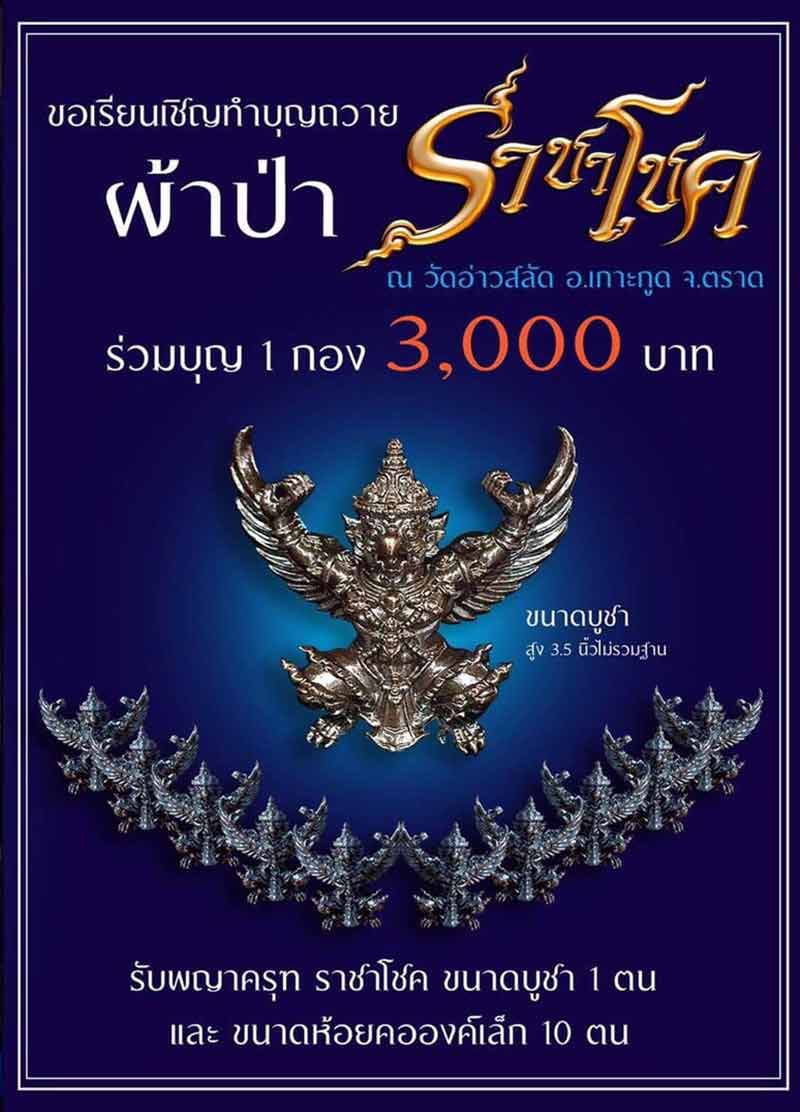 ผ้าป่ากองละ 3000บาท จะได้ครุฑ ราชาโชค ขนาดบูชา 1องค์ และขนาดลอยองค์ เนื้อสัมฤทธิ์รมมันปู อีก 10 องค์
