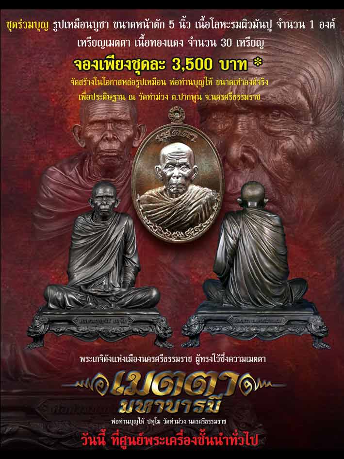 วัตถุประสงค์:เพื่อจัดสร้างรูปหล่อเหมือนพ่อท่านบุญให้เท่าองค์จริง ณ วัดท่าม่วง จ.นครศรีธรรมราช