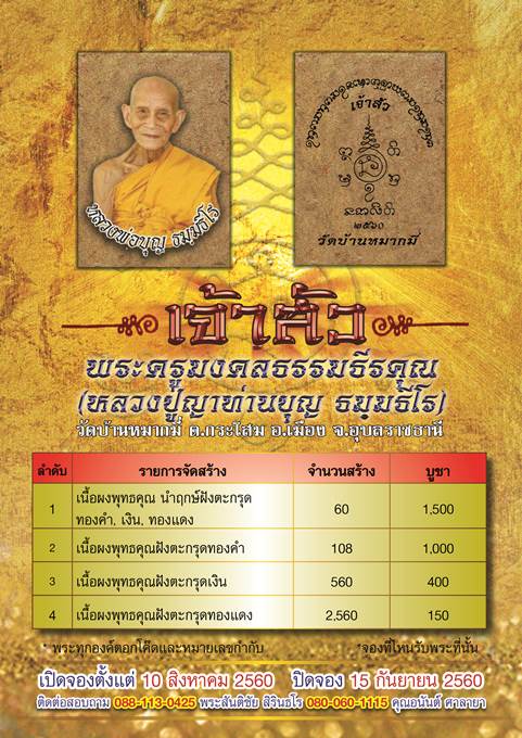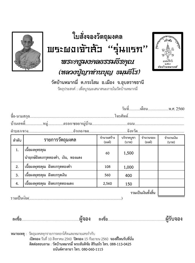 รายการ 1. เนื้อผงพุทธคุณ นำฤกษ์ฝังตะกรุดทองคำ,เงิน,ทองแดง ราคาจอง 1,500.-บาท มียอด = โทรสอบถาม
