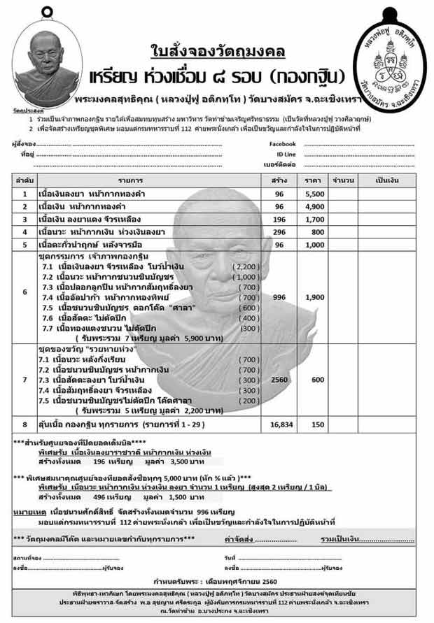 6. ชุดกรรมการเจ้าภาพกฐิน (รับพระ 7 เหรียญ) มี 6 ชุด ชุดละ 1,900 บาท