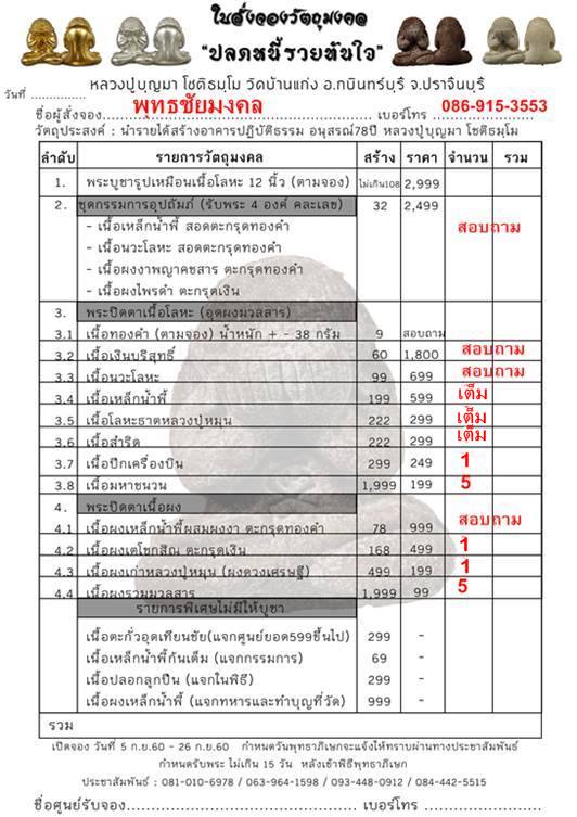 เปิดจอง 5 ก.ย.60 - 26 ก.ย.60 กำหนดพิธีพุทธาภิเษก จะแจ้งให้ทราบทางประชาสัมพันธ์