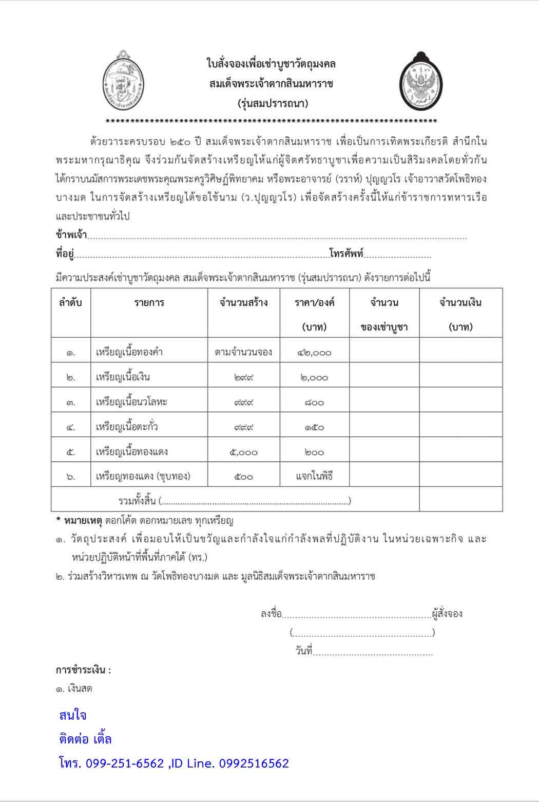 วัตถุประสงค์:เพื่อจะสร้างเทิดพระเกียรติพระเจ้าตาก ครบ 250ปี และจำนำรายได้ส่วนหนึ่งหลังจากหักค่าใช้จ่าย เพื่อร่วมสร้างวิหารเทพ ณ วัดโพธิทอง บางมด โดยนำเงินถวาย หลวงพ่อวราห์ต่อไป และจะนำเหรียญส่วนหนึ่งเพื่อแจกให้แก่กำลังพลทหารเรือ อีกส่วนหนึ่ง