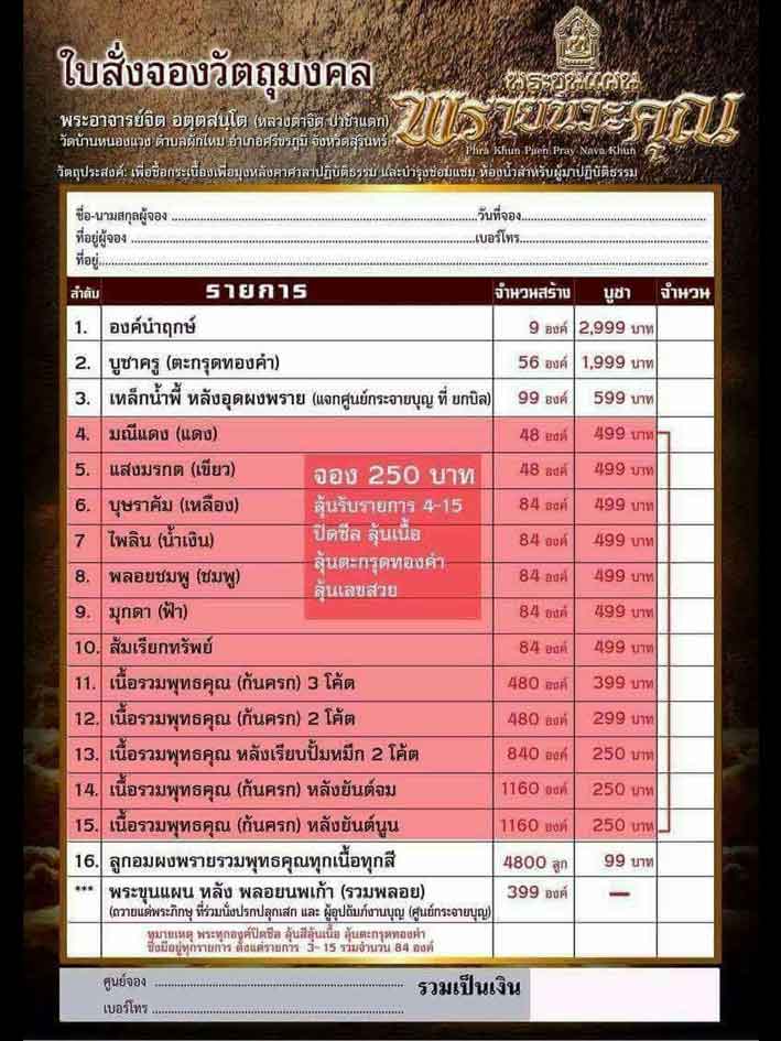 มีรายการลุ้น 250 บาท ต่อองค์ ลุ้นเนื้อรายการ 4-15 มียอด 30 องค์