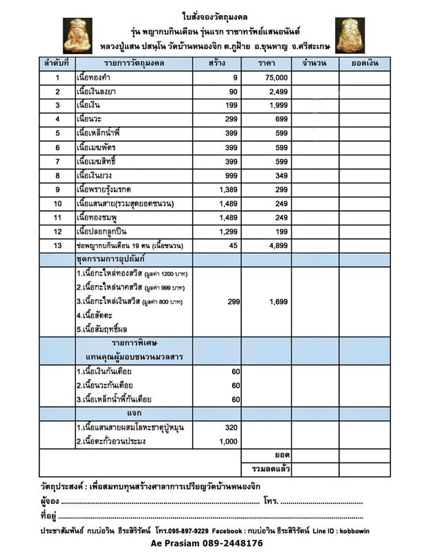 รายการ ชุดกรรมการอุปถัมภ์(รับวัตถุมงคล 5 รายการ) ราคาจอง 1,699.-บาท มียอด = 2