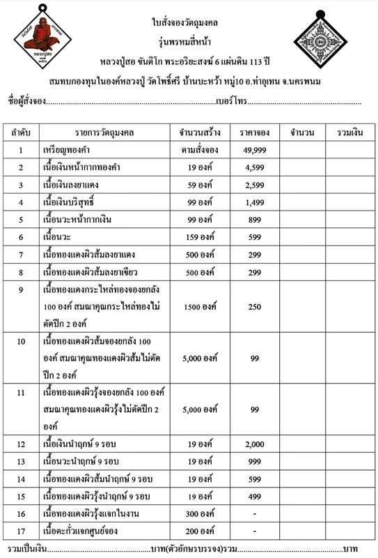 รายการ 9,10,11 กรณีต้องการสั่งจองยกลัง(100 เหรียญ) จะได้รับของสมณาคุณตามที่ระบุไว้ในใบรายการครับ ต้องการสั่งจอง = สอบถาม