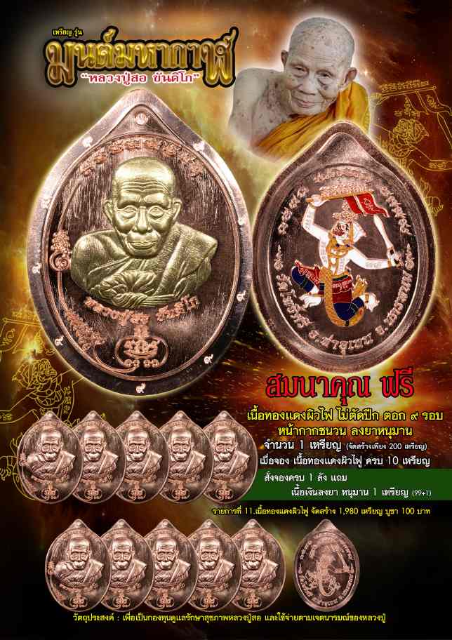จองเนื้อทองแดงผิวไฟยกลัง รับเนื้อเงินลงยาหลังหนุมาน 1 เหรียญ 99+1 และเนื้อทองแดงแถมอีก10เหรียญ รวมรับพระ 110 เหรียญ |
