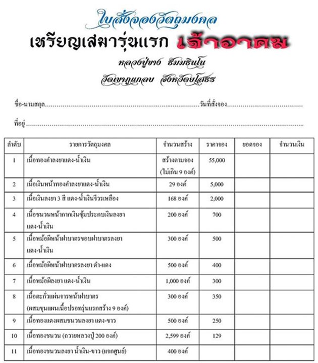 รายการ 8.เนื้อตะกั่วแผ่นจารหน้าฝาบาตร ราคาจอง 350.-บาท มียอด = 6