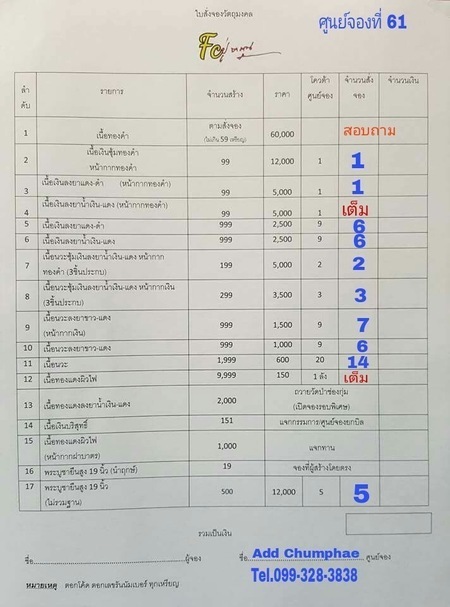 ศูนย์จองที่ 61 Add Chumphae (แอ๊ด ชุมแพ) มียอดตามรายการด้านล่างนี้เท่านั้น