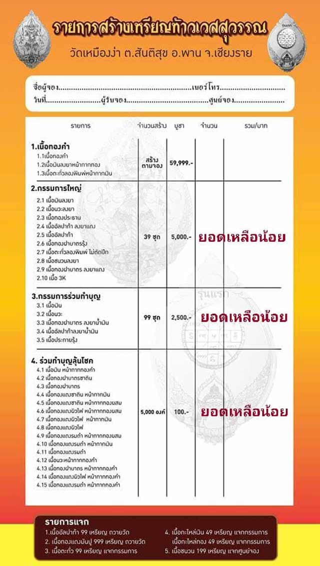 1.ชุดเนื้อทองคำ (รับพระ 3 รายการ) จอง 59,999 บาท สร้างตามจอง สั่งจองได้เลย