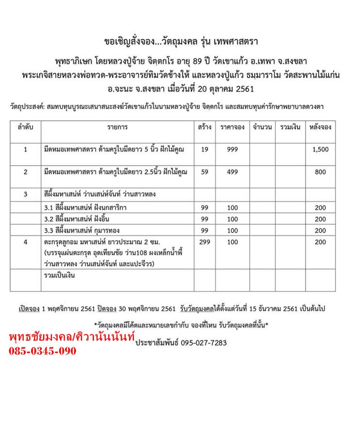 เปิดจองวัตถุมงคล รุ่นเทพศาสตรา พุทธาภืเษก โดยหลวงปู่จ้าย จิตตกโร อายุ 89 ปี วัดเขาแก้ว อ.เทพา จ.สงขลา และพระเะกจิสายพลวงพ่อทวด-พระอาจารย์ทิมวัดช้างให้ และหลวงปู่แก้ว ธัมมาโร วัดสะพานไม้แก่น อ.จะนะ จ.สงขลา เมื่อวันที่ 20 ตุลาคม 2561