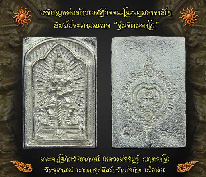 - รูปแบบสวยงาม ท้าวเวสสุวรณโณจตุมหาราชิกาพิมพ์ประภามณฑล ขนาดเหรียญกระทัดรัด ขนาดประมาณ 12*18 มม.