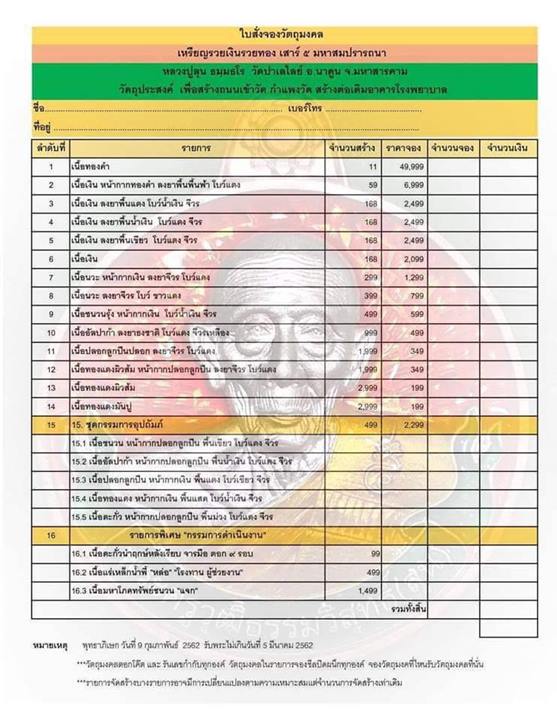 รายการ 5.เนื้อเงิน ลงยาพื้นเขียว โบว์แดง จีวร ราคาจอง 2,499.-บาท มียอด = 1
