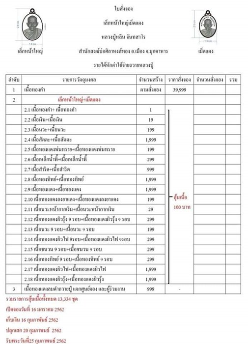 รายการ 2.ลุ้นเนื้อ (รับพระ 2 เหรียญ/ 1 รายการ) ราคาจอง 100.-บาท มียอด= 200