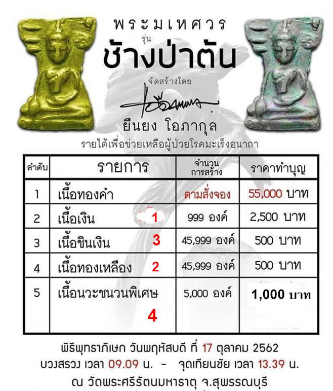 ....มีข่าวดีมาประกาศครับ เนื่องจากมีผู้อยากได้เนื้อเงิน 999 เป็นจำนวนมากที่จองเข้ามา แต่ว่ามันเต็มแล้ว คณะกรรมการจัดสร้างเลยตกลงจะเเบ่งเนื้อนวโลหะ จำนวน 2,000 องค์(จากที่จัดสร้างทั้งหมด5,000องค์เพื่อใช้แจกแขกผู้ใหญ่ที่มีอุปการะคุณ) เราขอจำหน่ายเพียงองค์ละ1,000 บาทเท่านั้นครับ และมีแค่2,000 องค์ จะมีรันนิ่งนัมเบอร์และตอกโค้ดเช่นเดียวกับเนื้อเงิน