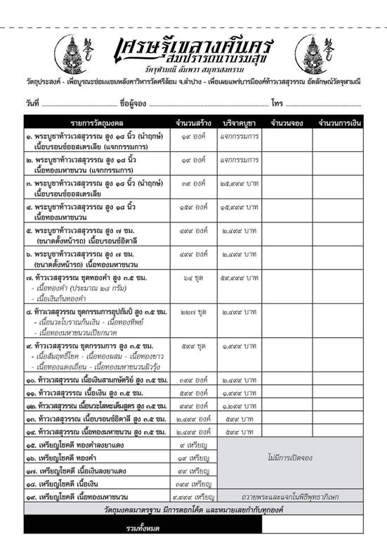 รายการ 6.พระบูชา สูง 7 ซม. เนื้อทองมหาชนวน (แถมเหรียญโชคดี ทองทิพย์ลงยาแดง) ราคาจอง 2,499.-บาท มียอด= 2