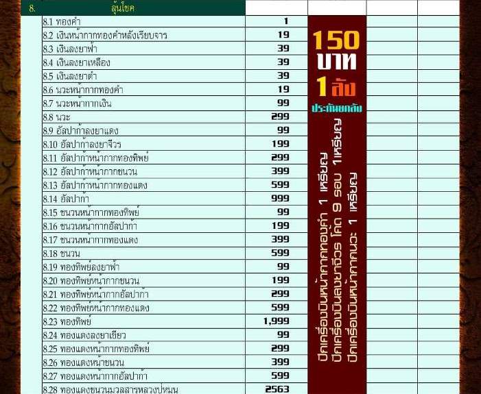 8.รายการลุ้นโชค 28 เนื้อ มียอด 30 เหรียญ ราคาจองเหรียญละ 150 บาท |