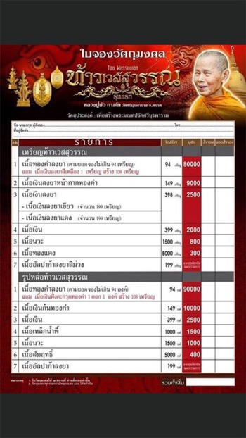 มีรายการเปิดให้จองจำนวน 30 คู่ โดย 1 คู่ เท่ากับ 1 ชุด เวลารับพระ จะได้รับ 1 เหรียญทองแดงและ 1 รูปหล่อเนื้อสัมฤทธิ์ ครับ รายการมีดังนี้ครับ