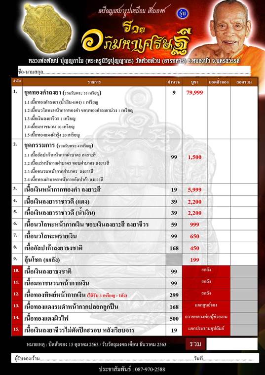 รายการ 1.ชุดเนื้อทองคำ (รับพระ 33 เหรียญ) ราคาจอง 79,999.-บาท มียอด= สอบถาม
