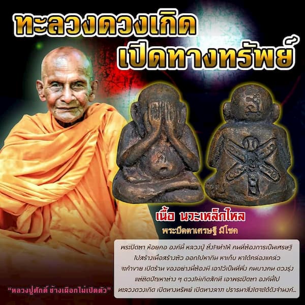 หลวงปู่ศักดิ์ท่านได้กล่าวว่า คนบางคน ดวงรุ่ง แต่ติดปัญหาต่างๆ ดวงไม่เกิดสักที เอาพระปิดตาองค์นี้ไป ทะลวงดวงเกิด เปิดทางทรัพย์ เปิดทางลาภ ปรารถนาสิ่งใดจะได้ดังจำนงค์