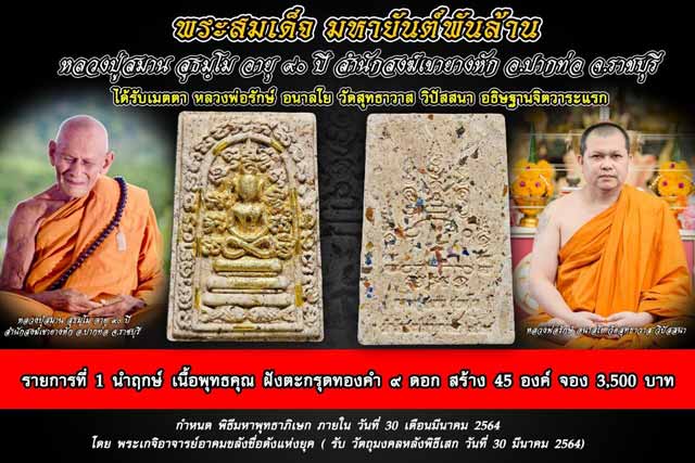 ในครั้งนี้ หลวงปู่สมาน เกจิอาคมขลัง อายุวัย 89 ปีได้มอบหายให้ลูกศิษย์ช่วยเป็นธุระสำคัญในการดำเนินงานและทำพิธีกรรม นั่นคือ พระครูปลัดสุรินทร์ ภทฺทมุนี พระครูบาสุรินทร์ เจ้าพิธีกรรมชื่อดัง ได้รวบรวมนำมวลสารเก่า พุทธคุณที่ลบผงไว้เป็นพันๆยันต์เป็นพันๆอักขระ จนหมดครบถ้วนทุกตำราที่เรียนมา ทำผงไปลบไปก็เสกเป่าไป ใช้ระยะเวลาทำเวลาเสกมานานกว่า ๑๐ ปี ซึ่งมวลสารนี้ หลวงปู่สมาน ได้ทำเก็บสะสม และปลุกเสกมา ให้มาจัดสร้างเป็นองค์พระสมเด็จมหายันต์พันล้าน เพื่อให้เป็นประวัติศาสตร์ เป็นของดีให้ลูกศิษย์ลูกหาได้มีไว้บูชา ด้วยอำนาจแห่งพลังพุทธคุณที่ได้ทำ ได้สร้าง ได้พุทธาภิเษกไว้ ได้ช่วยเหลือ ปกป้องคุ้มครอง อุดหนุน อุดมโชคลาภ บังเกิดมีแก่ลูกศิษย์ อยู่ถึงชั่วลูกชั่วหลานสืบไป