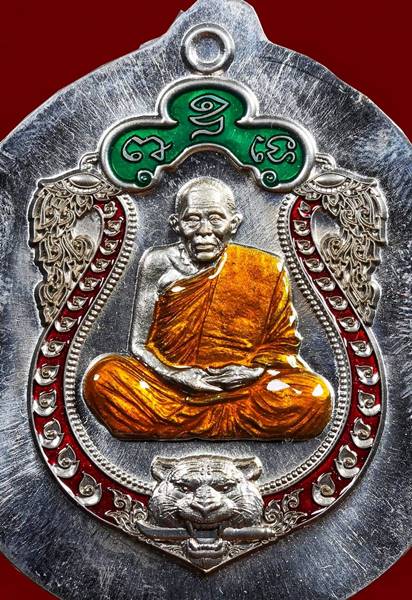 -เนื้อเงินลงยาราชาวดี พื้นแดง/บนเขียว/ขอบน้ำเงิน/จีวรเหลือง = 1 เหรียญ